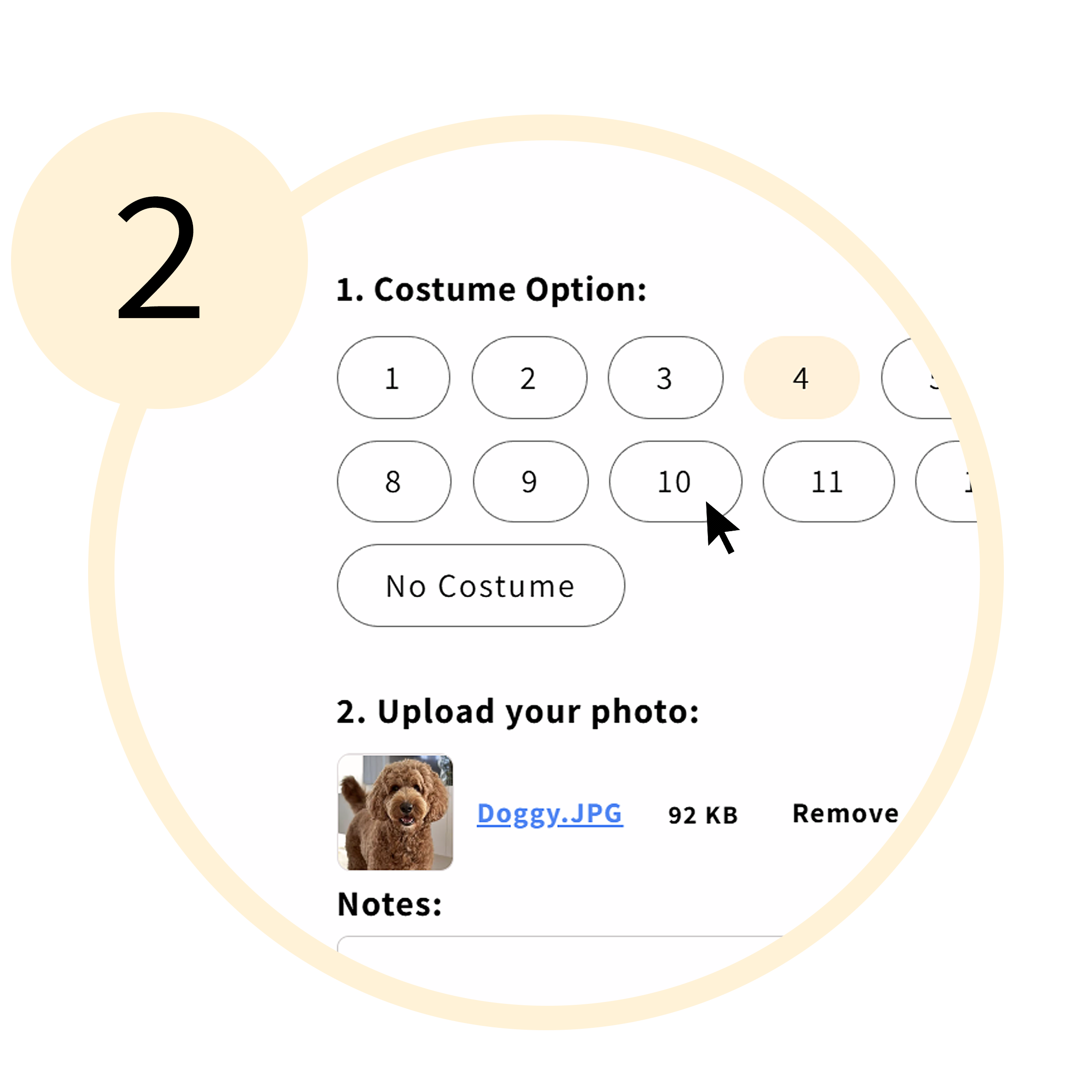 Choose a costume for your pet from the available options, upload your photo(s), and email us any specific details for the portrait. Request a sketch if needed.